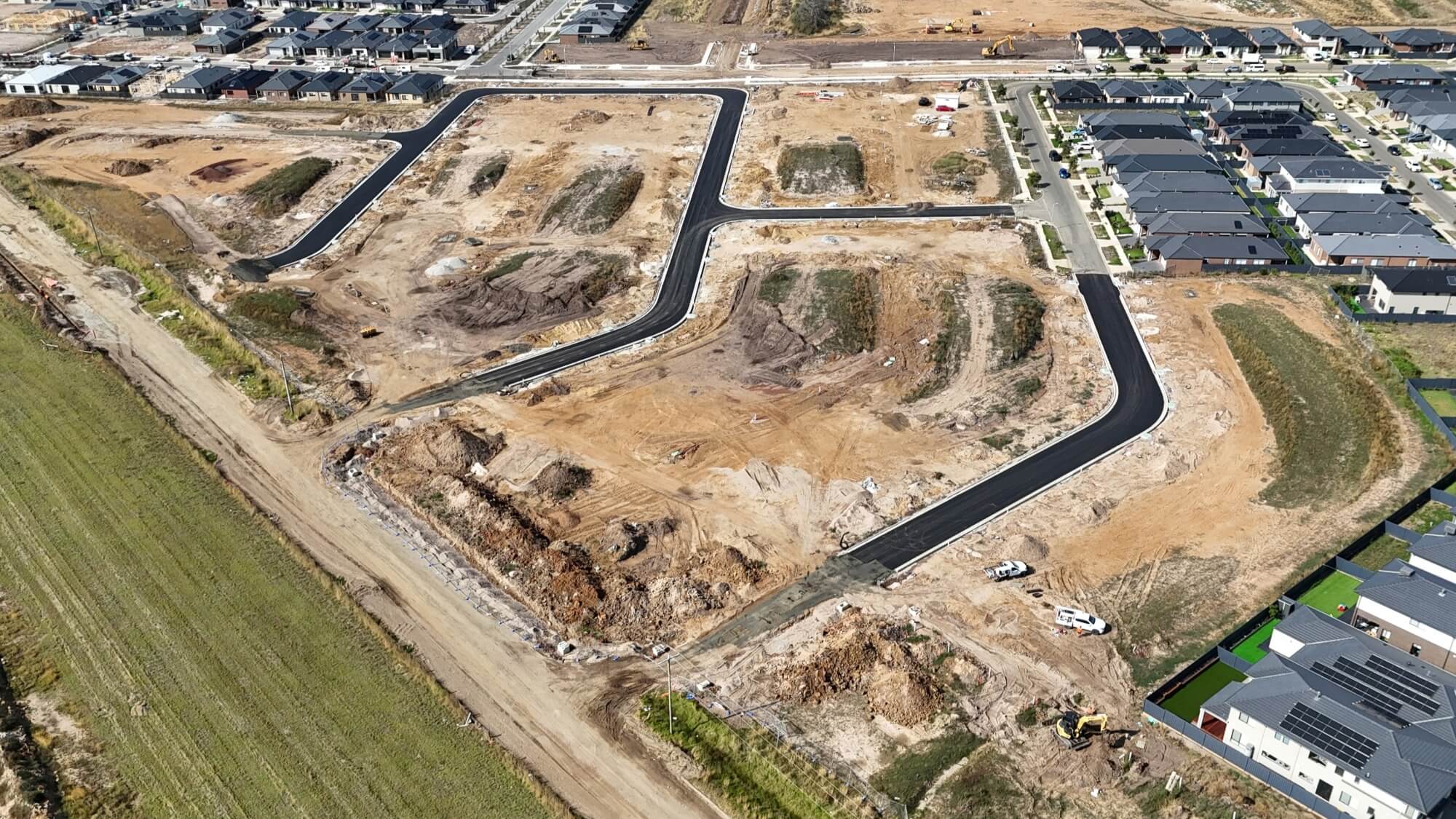 - Watermains, subsurface drainage, class 3 road pavement, kerb and base course asphalt complete.