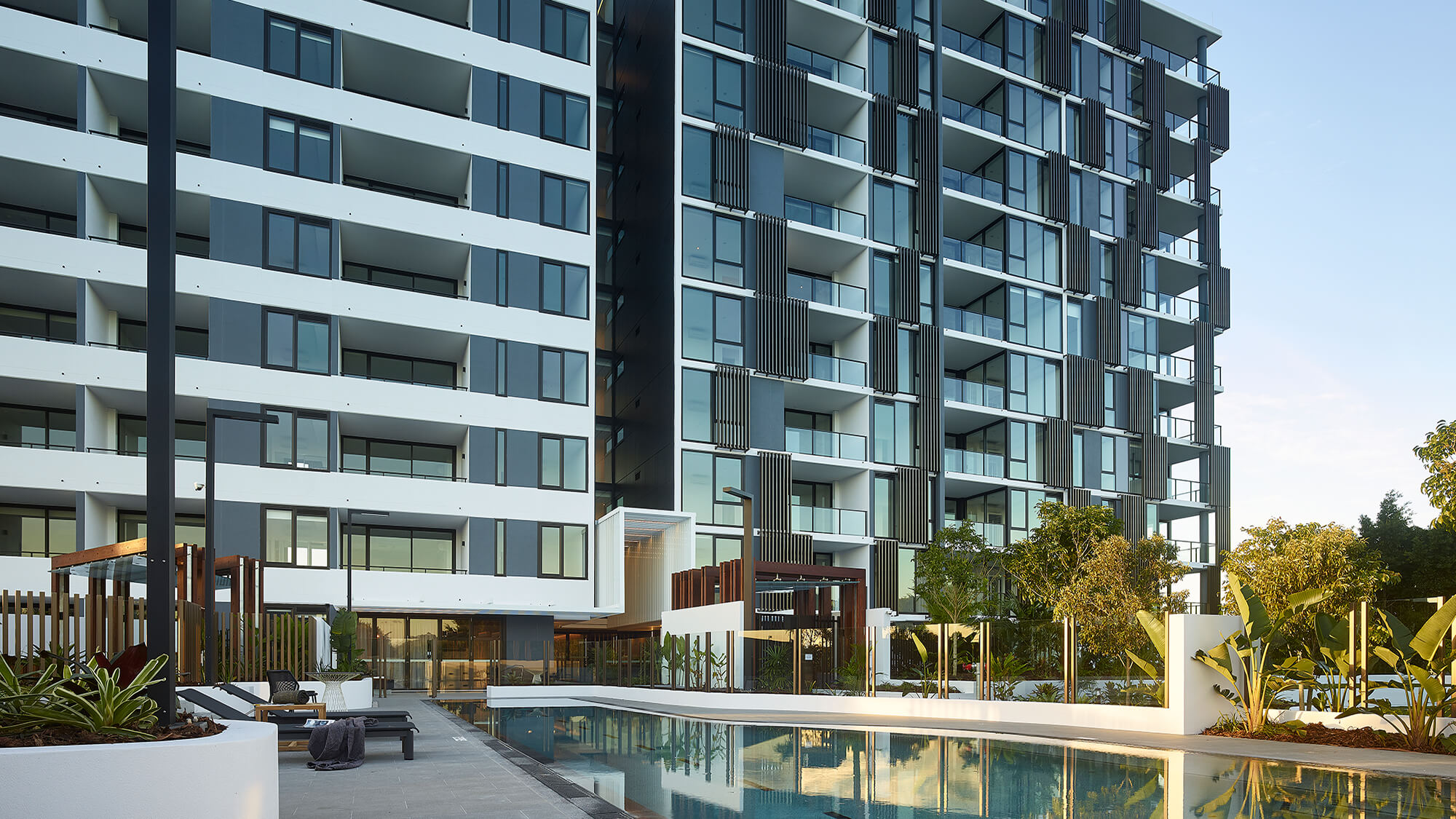 River facing apartments with resort style amenities, adjoining Riverlight North. Winner of 2019 Queensland Landscape Architecture Awards (Gardens).